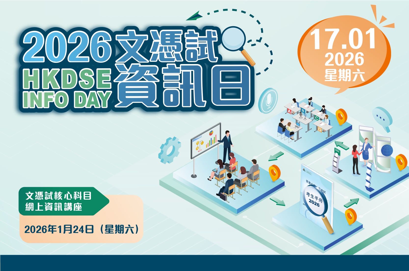 The HKDSE qualification is an important credential for students pursuing further studies and career development. To enhance understanding of the examination among candidates and the public, the HKEAA will host the HKDSE Info Day on 17 January 2026 (Saturday), at its Hung Hom Office and Examination Centre. Information seminars and an exhibition by overseas education bodies and relevant Consulates-General will be held on-site. Participants can also experience the Oral Recording System for the English Language speaking examination.