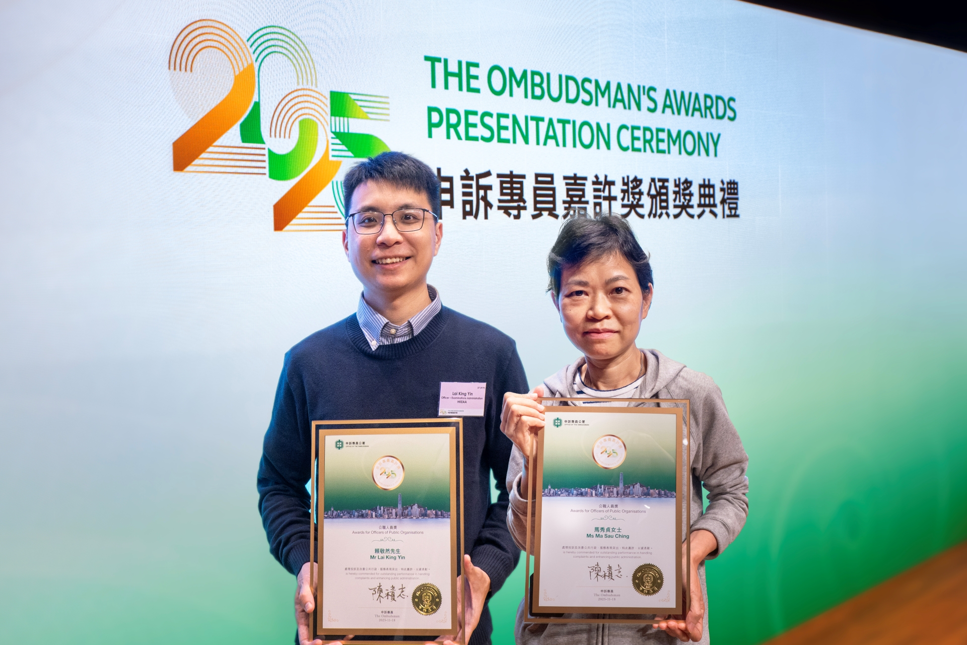 Mr Derek Lai King-yin (left) and Ms Shirley Ma Sau-ching (right) of the HKEAA – Proud winners of The Ombudsman’s Awards 2025 for Officers of Public Organisations.